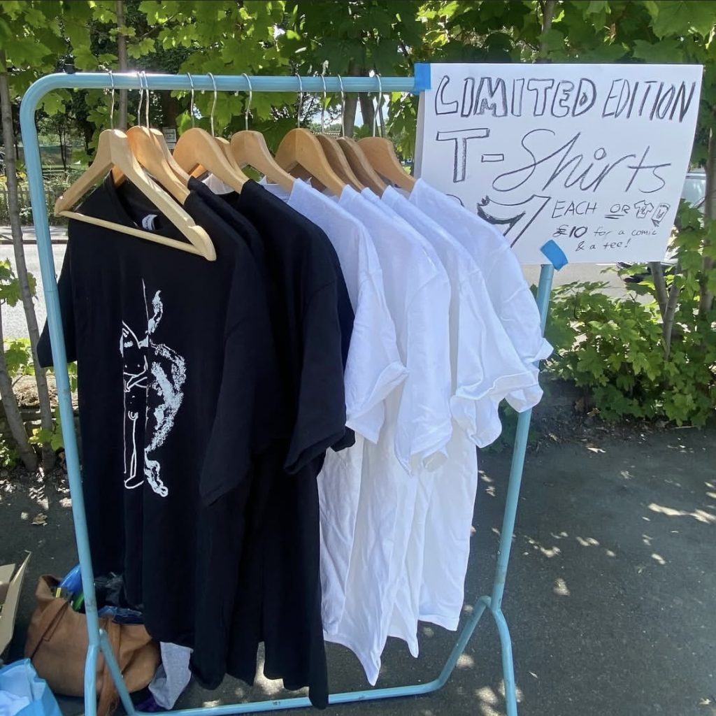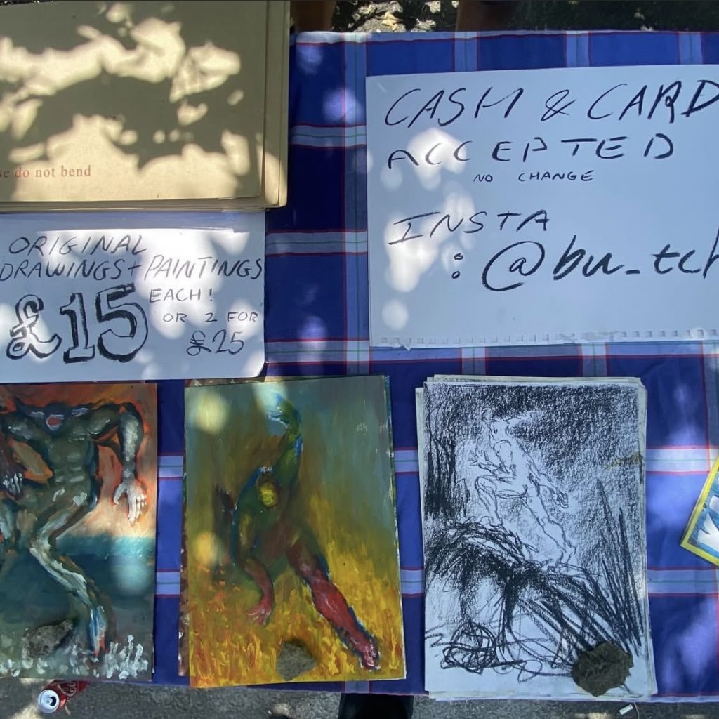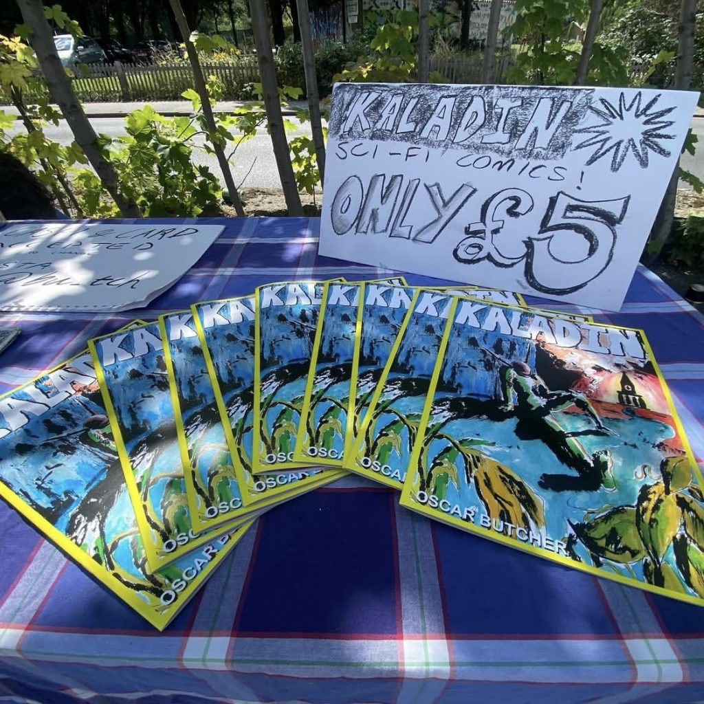 Oscar Butcher’s artist stall selling ‘Kaladin’ copies, T-shirts, paintings, and prints